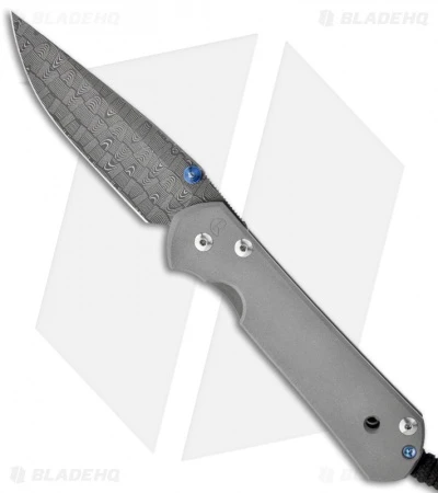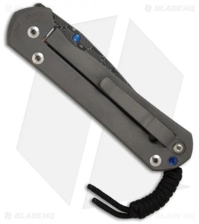 This Large Sebenza 21 features a Devin Thomas Basket Weave Damascus steel blade. Bead blasted titanium handle and pocket clip. Blue thumb lug and spacer. Includes lanyard and leather pouch.