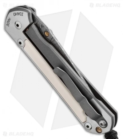 This Large Sebenza 21 model features a Devin Thomas stainless “Basketweave” Damascus steel blade. The satin finished titanium handle features Mammoth inlays. Polished gold thumb lug and spacer are chosen to coordinate with the color of the inlays. The frame lock bar and pocket clip are bead blast finished titanium.