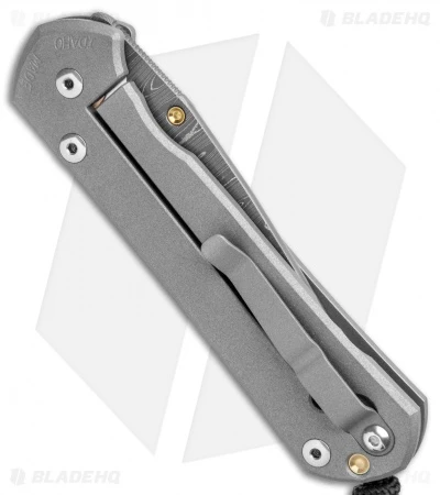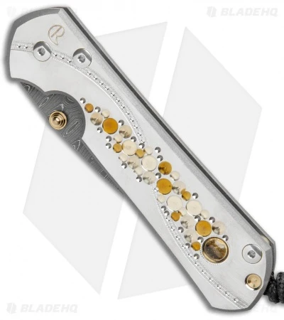 This Large Sebenza 21 features a satin finished titanium handle face with a Unique Graphic. The framelock and pocket clip are bead blast finished. Gold thumb lug and spacer. This Sebenza has a ladder Damascus steel blade. Includes lanyard and leather pouch.
