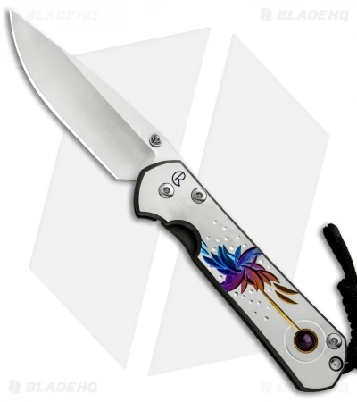 This Small Sebenza 21 features a satin finished titanium handle face with a Unique Graphic and an Amethyst Cabochon. The frame lock and pocket clip are bead blast finished with a satin finished thumb lug and spacer. This Sebenza has a satin finished S35VN stainless steel blade. Includes lanyard and leather pouch.