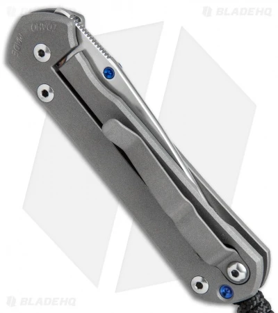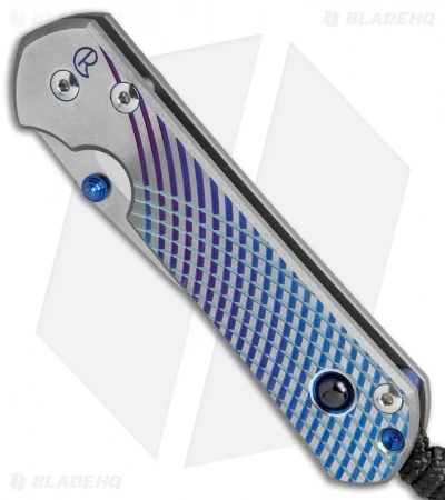 This Small Sebenza 21 features a satin finished titanium handle face with a Unique Graphic and a Blue Sapphire Cabochon. The frame lock and pocket clip are bead blast finished with a blue anodized finished thumb lug and spacer. This Sebenza has a satin finished S35VN stainless steel blade. Includes lanyard and leather pouch.