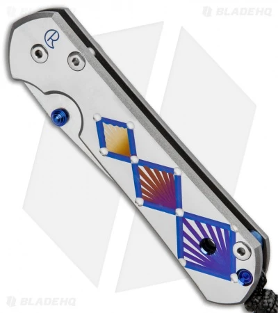 This Small Sebenza 21 features a satin finished titanium handle face with a Unique Graphic diamond pattern. The frame lock and pocket clip are bead blast finished. Item has a blue thumb lug and spacer. This Sebenza has a polished S35VN stainless steel blade. Includes lanyard and leather pouch.