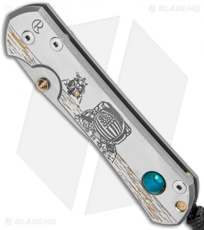 This Small Sebenza 31 features a satin finished titanium handle face with a Lunar Landing computer generated graphic (CGG) and a chrysocolla cabochon inlay. The framelock and pocket clip are bead blast finished. It is outfitted with a stonewashed S35VN stainless steel blade with a gold thumb lug. Includes lanyard and leather pouch.