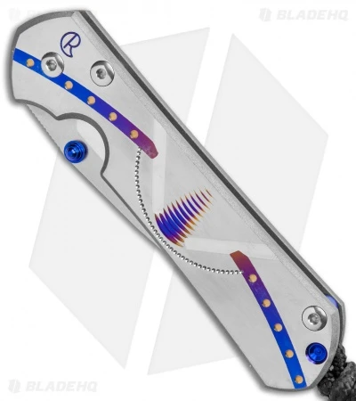 - Milled titanium handle scales with a purple and blue beehive unique graphic.